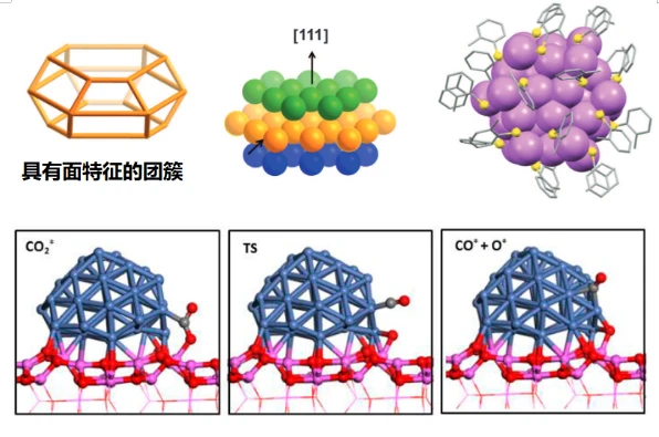 第四节:团簇吸附与催化应用 团簇往往在化学过程中发挥关键作用,因此其表面配位以及反应特性直接关乎其性能。本小节从团簇自身稳定性角度出发,演示如何引入覆盖从而提高稳定性,进而选择经典的金团簇表面有机分子包覆,展示利用对称快速引入覆盖层(Sci. Adv. 2015;1: e1500425)。作为催化反应,团簇/载体构型选择以及团簇活性位识别,会通过CO2还原反应等经典反应来形象讲解界面团簇原子分层、混合价态催化、协同催化等概念。建模初始如何基于团簇-载体作用判断可能的活性位是本节的重点,而进一步考虑小分子协同吸附则是难点所在,如下图展示了团簇界面原子诱导了CO2解离吸附(ACS Catal. 2016, 6, 4501−4505)。