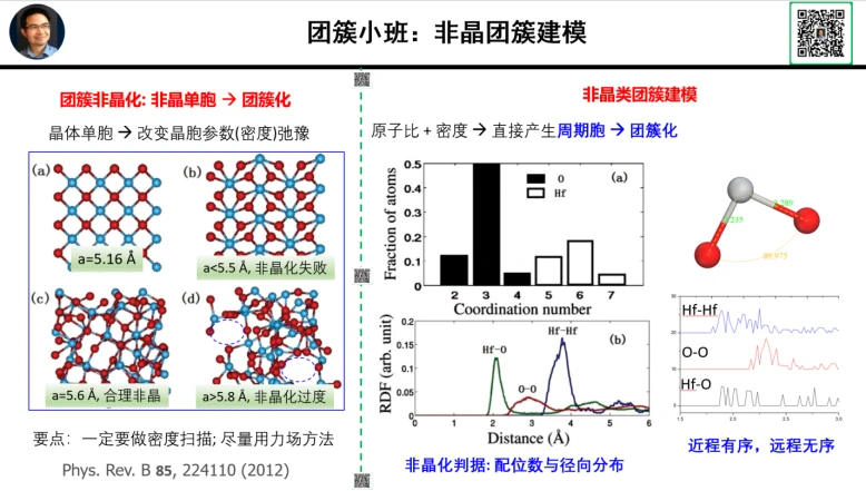 团簇,就是一伙原子,数量不多,但很奇幻!它优美地把孤立原子与固体和表面联系起来,但又不同于原子/小分子。现实应用中,大量催化、医药、储能、超导,都能看到团簇的影子,例如Science曾经多篇论文探讨C60团簇和超导。 团簇建模有两种典型思路。Bottom-up策略,用一个个原子按照一定规则构建,这适用于小团簇,因为团簇构型会随着原子数增加而指数级增加;周期结构团簇化则是另外一个实用策略,通过构建或调用周期模型,抓主要结构单元和结构特征从而构造团簇,此时不仅能处理多大数百原子的团簇,还能考虑纳米颗粒的部分表面特征。 计算上,如何评判团簇模型?如何研究团簇的电子结构?以及如何将团簇负载到一定环境满足应用需求?这些都是团簇小班要解决的问题。计算老司机用一个个案例,讲解团簇稳定性、周期结构团簇化技巧以及团簇分析。分子轨道会作用最重要的一个工具引进团簇电子结构分析,并将其应用到催化、电池等热门领域。 延续老司机课堂的传统,我们追求:能建模、会计算、善分析。4节理论配合2节操作,每节操作都有完整案例,包含建模、参数测试、计算、数据分析。老司机倡导浸入式学习,用案例带动理论和方法学习!课程报名请联系V:jisuanlaosiji 第一节:团簇建模与周期结构团簇化 现实中我们受制于所研究的问题与计算软硬件能力,大量结构我们无法用周期性模型取处理,例如很多MOF结构、分子筛等,因为计算量很大、很多也没有必要。如何从晶体学数据库的周期结构模型快速合理的团簇模型(周期结构团簇化),是本节的重点。老司机用典型金属、合金团簇展开,引入团簇的表征概念,例如配位数、径向分布函数等,使得团簇建模能用定量数据去评估、甚至同实验结果进行比对。这种处理方法的一个典型应用就是非晶团簇建模(如下图),我们可以从典型晶体出发,借助分子动力学和定量判据,获得贴近实验样品特征的非晶团簇模型。