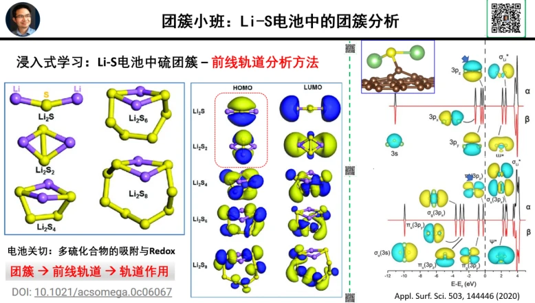 第三节:团簇负载与作用分析 在能源、材料与化学化工等领域,团簇以及纳米颗粒往往需要负载到廉价基体上,因此如何构建团簇-载体模型对于后续研究就非常关键。本小节根据不同团簇类型、团簇电子结构以及具体研究问题,演示如何平衡取舍并快速做结构扫描。模型方面会讲解表面负载、孔道负载、笼结构负载等。同时会重点选择电池应用、催化应用案例,进一步演示如何灵活地将分子轨道、投影态密度、局域电荷等工具融入到团簇-载体的分析中。最后会进一步解释何为强基底作用,以及对典型化学体系的影响。下图展示Li-S电池中频繁遇到的Li2Sn团簇的电子结构分析。