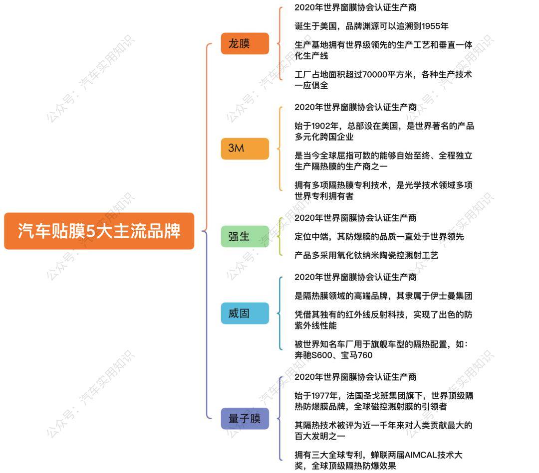 汽车玻璃贴膜不仅能提供防紫外线、隔热、保护隐私和增加安全性的多重好处,还能让你的车看起来更加美观。所以,如果你还没有给你的爱车贴膜,那真的是应该考虑一下了。 下面我就来具体说说,该如何给自己的爱车挑选汽车玻璃贴膜。 怎样挑选汽车贴膜?有哪些选购要点? 选购要点: 品牌: 类型: 参数: 颜色深浅: 品牌: 贴膜品牌是我们考虑的一个重要因素,它们的具体介绍大家可以参照下图。 国际头部品牌:威固、3M、强生、龙膜、量子膜; 国产头部品牌:中国航天SANYOU、美基 、瑞盾;