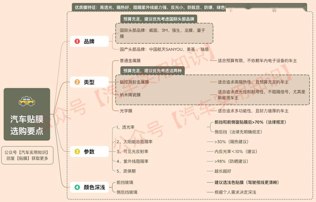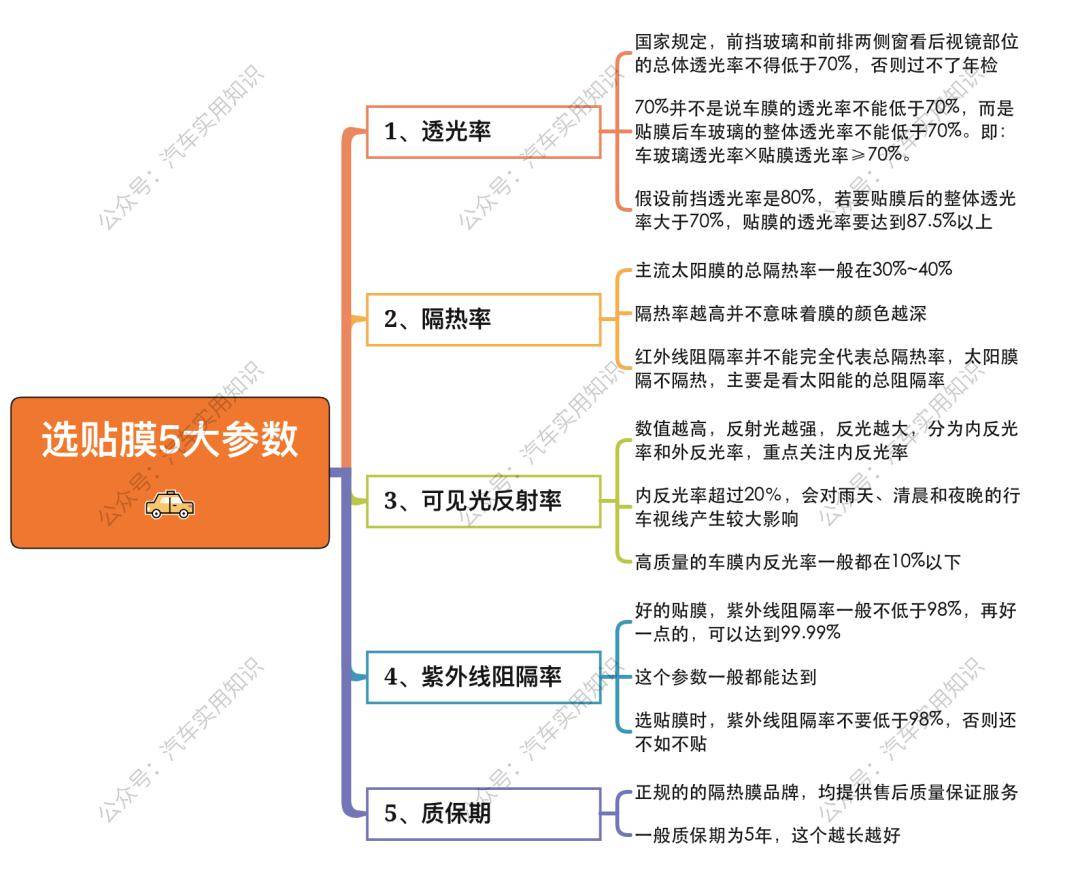 如今,市面上的汽车贴膜五花八门,价格、质量更是参差不齐,让人眼花缭乱。那对于我们普通车主来说,该如何给自己的爱车挑选车膜呢?要看哪些参数?有哪些品牌的车膜比较推荐呢? 今天,我把自己曾经的经历和选购时踩过的坑,总结成了选购汽车玻璃贴膜的攻略和经验,希望能够帮助更多的车主朋友轻松选到一款性价比高、适合的产品。 注:本文是我花了4周时间写的,其中包括查阅大量资料、来回对比贴膜参数、制作思维导图和表格,真诚推荐,并非营销文,大家记得先点赞收藏再看,以免下次找不到。 文章目录: 有必要给汽车玻璃贴膜吗?有什么好处? 如何选汽车贴膜?有哪些选购要点? 总结选购建议! 汽车贴膜注意事项! 优质汽车贴膜推荐! 有必要给汽车玻璃贴膜吗?有什么好处? 当然有必要,贴膜对于汽车玻璃来说有多重好处的。