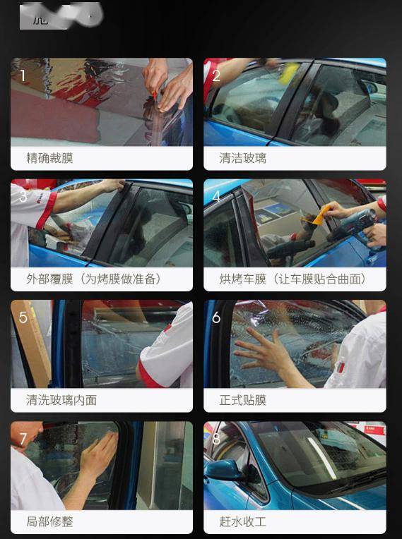 四、贴膜后注意事项 1、贴膜后,晴天三天内请勿升降玻璃,阴雨天一周内不要升降玻璃; 2、贴膜后一周内,请勿开空调直吹玻璃,也不要洗车和清洗内饰; 3、贴膜后30天内不要开启除雾电热丝; 4、贴膜30天内,避免使用吸盘等装饰物吸附于玻璃内侧贴膜表面; 5、请不要将带有粘性的标签直接黏贴在膜上,请使用静电吸附专业年检静电贴; 6、不要用指甲或者尖锐物将膜边缘拨开,以免污物进入; 7、请勿用力擦拭清洁玻璃内侧,同时避免硬物接触,以免造成划痕。