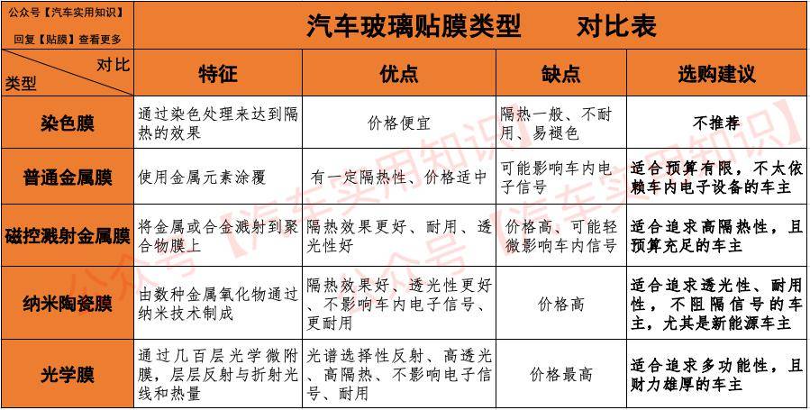 选购建议如下: 预算充足,优先选择国际头部品牌,其次选择国产头部品牌。毕竟大品牌的质量更安全可靠,售后更靠谱、更有保障一些。 类型: 目前市场上的汽车贴膜大致可分为以下5类,即:染色膜、普通金属膜、磁控溅射金属膜、纳米陶瓷膜、光学膜,它们各自的优缺点,大家可以看下表进行了解。