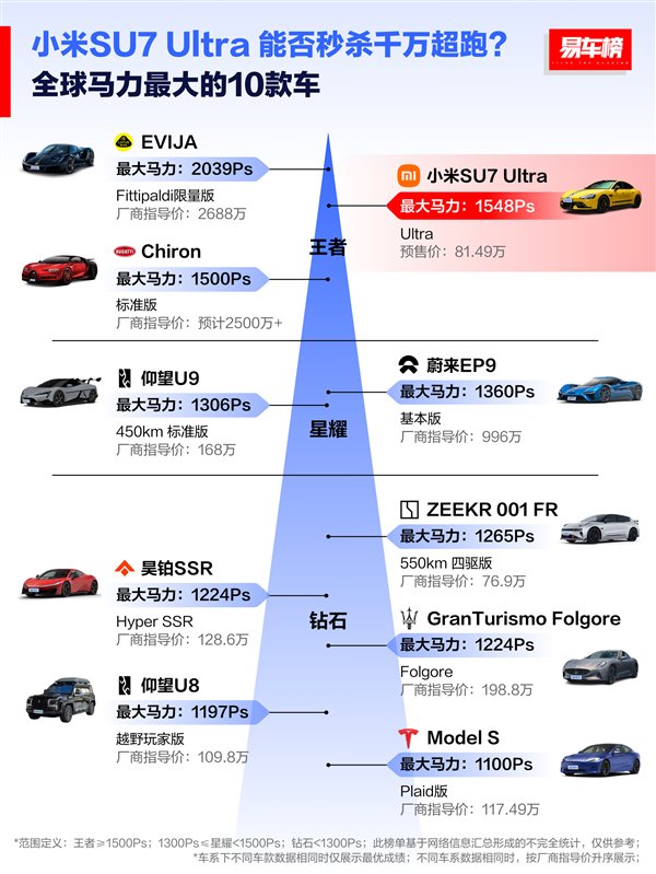 至于全球马力最大的榜单中,小米SU7 Ultra仍位居第二名,第一则是路特斯EVIJA,其最大马力2039Ps,小米SU7 Ultra为1548Ps。