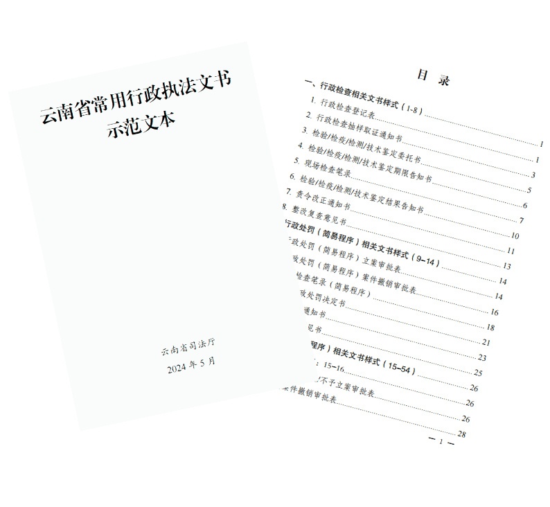 原标题:统一行政执法文书 提高行政执法水平 近日,云南省司法厅印发《云南省常用行政执法文书示范文本》供全省行政执法部门参考适用。省司法厅作为代表省人民政府履行行政执法监督职责的职能部门,拟通过推行全省通用的行政执法文书,进一步规范行政执法行为,纵深推进行政执法“三项制度”,提高执法案卷、文书规范化水平,促进全省各级行政执法部门依法履行行政执法职责。