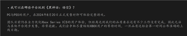 快科技6月8日消息,《黑神话:悟空》今日在Steam、Epic、腾讯WeGame等平台开启预售,游戏将于8月20日正式上线。 同时,游戏科学发布游戏预购常见问题解答,其中提到《黑神话:悟空》Xbox Series X|S版将会延期发售。 官方表示,团队目前仍在全力优化Xbox Series X|S的用户体验,但距离达到我们的品质要求还有不少工作没有完成,因此无法与其他平台同步发售,非常抱歉。 游戏科学争取尽量缩短XBOX用户的等待时间,一旦品质达标会第一时间公布准确的上线日期。 对于有些国家、地区还不能预购《黑神话:悟空》的问题,官方解答称由于平台规则约束,部分国家、地区的上线政策要求不同,在前置审核没有完成时,不能在对应区域的数字商店上架。 发行团队正在积极配合提审,争取全球天命人都能同步体验到《黑神话:悟空》。 (责任编辑:) |
