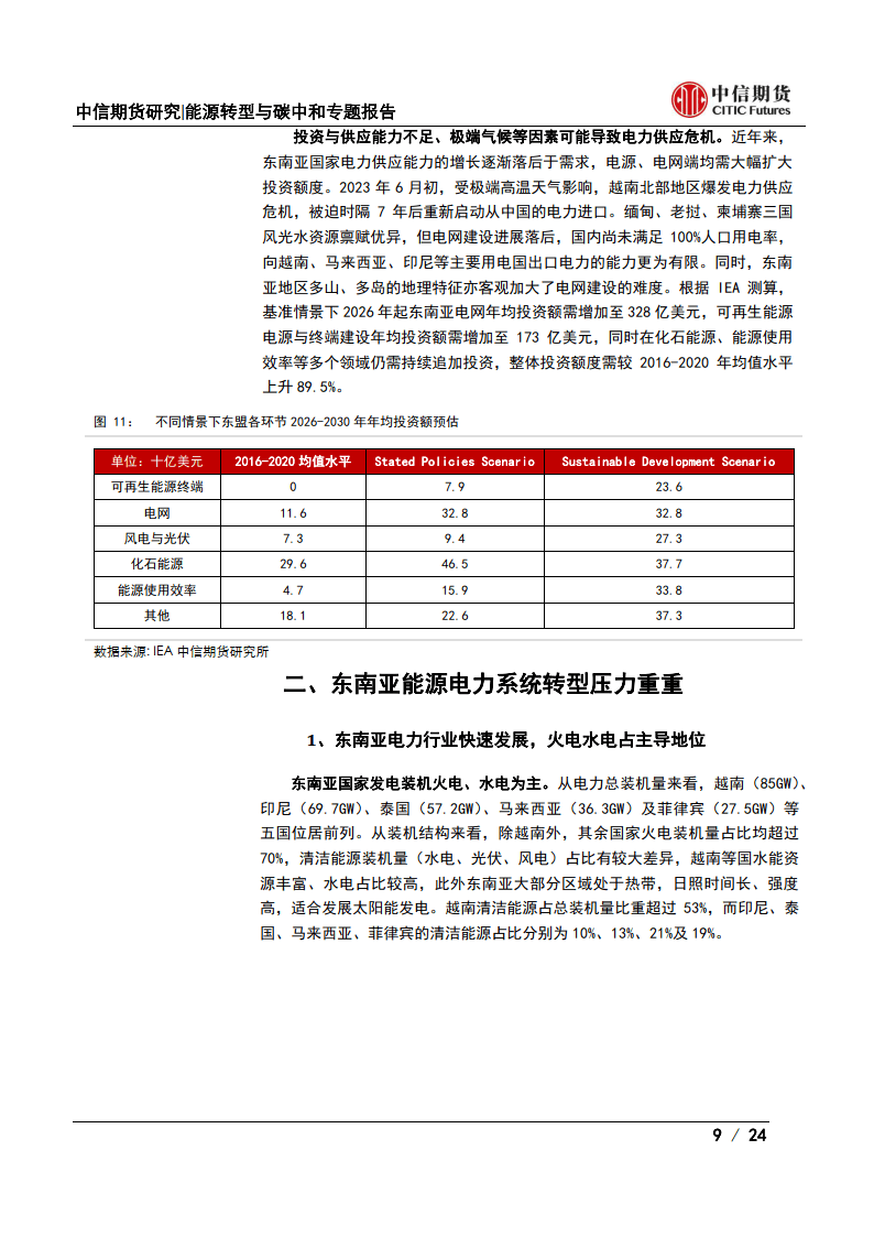 发布于:广东省 今天分享的是:《新兴市场系列专题报告之东南亚能源篇:东南亚电力市场,增长的前景与转型的压力》 (内容出品方:中信期货) 报告共计:24页 摘要东南亚国家电力需求保持强劲增长,电网等投资建设不足、极端气候可能导致电力供应危机。印尼、越南、泰国、马来西亚、菲律宾占东盟用电需求 90%以上,电力弹性系数保持在 1.21 左右,预计短期东南亚电力消费增速有望反弹至 5.4-6%,工业和交通领域用电占比将继续提升。电力系统投资建设不足、极端气候等可能导致电力供应危机。 东南亚电力系统过于依赖化石能源,火电水电占主导地位,能源转型节奏偏慢。印尼等5国火电装机占比高达 68%,过去十年中新增火电装机占比 53%,清洁能源转型节奏较慢。虽然各国纷纷制定趋向碳中和的政策目标,但减排潜力小、空间小,因此转型节奏偏慢、退煤压力重重。 煤炭为东南亚经济强劲增长提供廉价、稳定的动能,但融资限制和气候目标将影响未来煤炭消费增长曲线,经济增长对煤炭的“路径依赖”也将使东南亚的退煤之路道阻且长。印尼作为东南亚地区最大的煤炭生产和出口国,虽已申明2030年碳中和目标,但其得天独厚的煤炭资源与模糊的清洁能源路线,预示着能源系统转型困难,同时资本开支与产业政策将影响该地区未来煤炭产量增速。越南近年来经济快速增长,对煤炭进口需求持续大幅扩张,同时越南煤电机组非常年轻,转型面临着高昂的成本。 东南亚光伏产业出口导向为主,未来外需存在风险,需挖掘本土市场、延伸产业链。东南亚国家光伏产能庞大,主要承接了中国的产业转移,服务于对欧美的出口,因此外需依赖度较高,内需市场规模有限,难以消化过剩产能。美国双反豁免即将到期,东南亚光伏产品出口需求面临政治风险,因此亟需向内挖掘本土市场消化能力,并提高产业链纵深程度,向上游或辅材环节延伸。