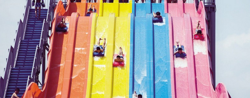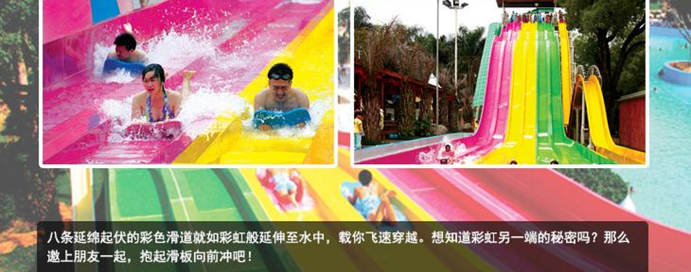 彩虹赛道 八条延绵起伏的彩色滑道就如彩虹般延伸至水中,载你飞速穿越。想知道彩虹另一端的秘密吗?那么邀上朋友一起,抱起滑板向前冲吧!