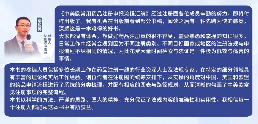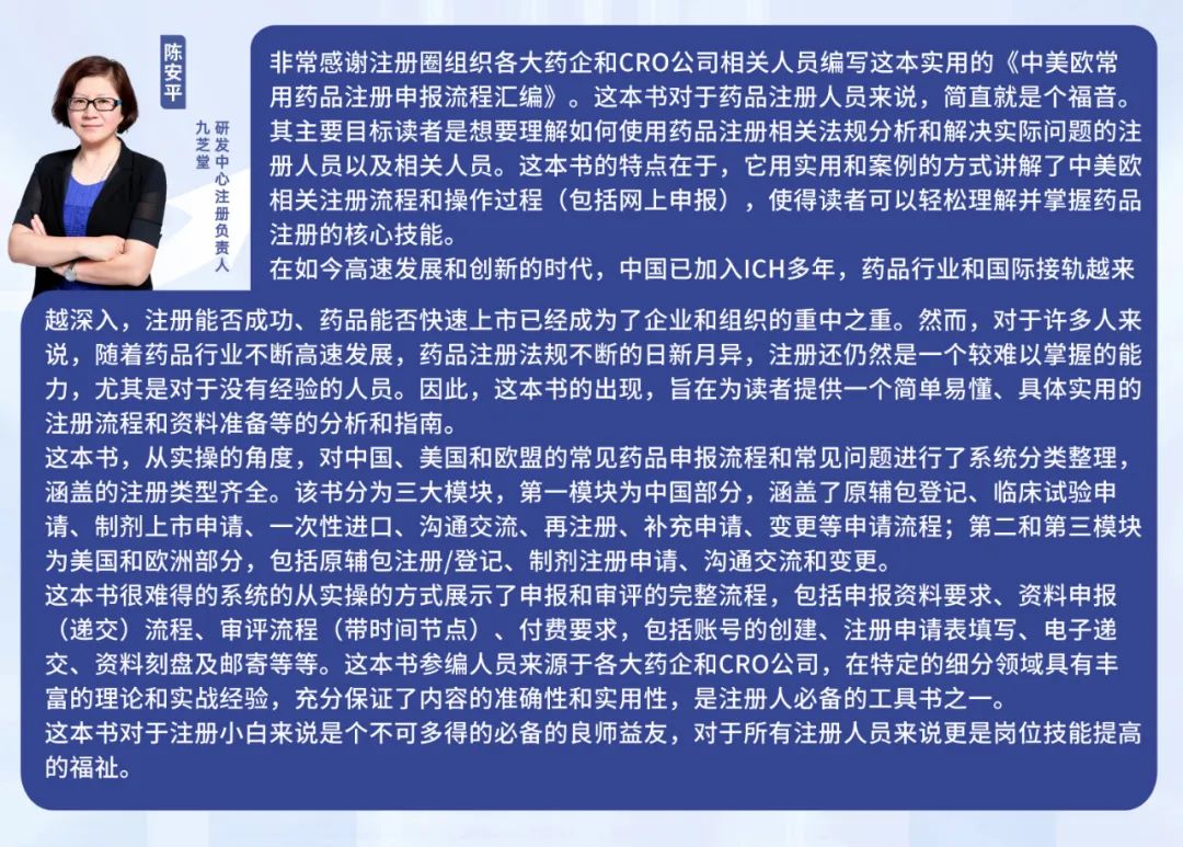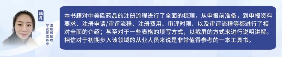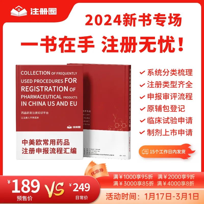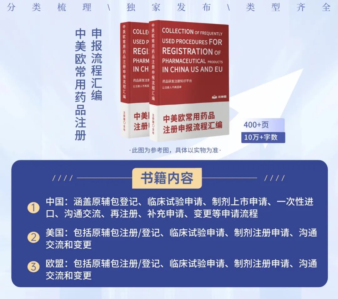 本次书籍由以下企业全程赞助推出: 沈阳悉咨生物医药科技服务有限责任公司 苏州柯里特信息科技有限公司 北京易语堂咨询服务有限责任公司 药品注册是药品研发和上市的关键环节,而中美欧又是全球药品市场的重要区域。对于药企和研发机构而言,了解和掌握中美欧药品注册流程是必备的技能。那么,如何才能全面、系统地了解这些流程呢?《中美欧常用药品注册申报流程汇编》正是您需要的答案之书! 注册圈本次携手10多位行业专家共同整理打造此次书籍。本书籍不仅仅是一个简单的流程汇编,更是一次中美欧药品注册的深度探索。它以实际操作为基础,深入浅出地介绍了中国、美国和欧盟的药品注册流程,为您揭示了那些看似复杂、繁琐的步骤背后的逻辑与规律。 书籍介绍 《中美欧常用药品注册申报流程汇编》这本书从实操的角度,对中国、美国和欧盟的常见药品申报流程和常见问题进行了系统整理。分为三大模块:第一模块为中国部分,涵盖了原辅包登记、临床试验申请、制剂上市申请、一次性进口、沟通交流、再注册、补充申请、变更等申请流程;第二和第三模块为美国和欧盟部分,包括原辅包注册/登记、临床试验申请、制剂注册申请、沟通交流和变更。 《中美欧常用药品注册申报流程汇编》目录 (下滑查看) 中国药品注册申报流程汇编 1. 申报账号创建 1 1.1 NMPA政务服务门户账号注册 1 1.2 CDE申请人之窗账号注册 3 2. 申报流程 6 2.1原辅包登记流程 6 2.1.1 申报流程图 6 2.1.2 CDE申请人之窗申报流程 7 2.1.3 申报资料清单(NMPA政务服务门户/办事指南) 19 2.1.3.1 原料药 19 2.1.3.2 药用辅料 19 2.1.3.3 药包材 20 2.2 境内&境外生产药品临床试验申请 21 2.2.1 申报流程图 21 2.2.2 NMPA申报流程 22 2.2.2.1 境内生产药品临床试验申请 22 2.2.2.2 境外生产药品临床试验申请 28 2.2.3申报资料清单 35 2.2.3.1 境内生产药品临床试验申请资料清单 35 2.2.3.2 境外生产药品临床试验申请资料清单 36 2.3 境内&境外生产药品上市许可申请(含新药和仿制药) 37 2.3.1 申报流程图 37 2.3.2 NMPA申报流程 38 2.3.2.1 境内生产药品上市许可申请 38 2.3.2.2 境外生产药品上市许可申请 43 2.3.3 申报资料清单 50 2.3.3.1 境内生产药品上市许可申请资料清单 50 2.3.3.2 境外生产药品上市许可申请资料清单 51 2.4 境内产药品再注册 52 2.4.1 NMPA再注册申报流程(含药品再注册申报资料清单) 52 2.5 境外生产药品再注册申请 59 2.5.1 境外药品再注册流程图 59 2.5.2 NMPA再注册申报流程 60 2.5.3 境外生产药品再注册资料列表 66 2.6 境内&境外药品补充申请 67 2.6.1 申报流程图 67 2.6.2 NMPA申报流程 67 2.6.2.1 境内生产药品补充申请 67 2.6.2.2 境外生产药品补充申请 75 2.6.3 申报资料列表 82 2.6.3.1境内药品补充申请资料清单 82 2.6.3.2 境外药品补充申请资料清单 83 2.7 境内生产药品备案 84 2.7.1 NMPA备案流程(含备案资料清单) 84 2.8 境外生产药品备案 92 2.8.1 备案流程图 92 2.8.2 NMPA备案流程(含备案资料清单) 93 2.9 沟通交流会 101 2.9.1 沟通交流会流程图 101 2.9.2 沟通交流会分类 102 2.9.3 CDE申请人之窗申请流程 103 2.9.4 沟通交流会资料要求清单 106 2.10 一次性进口(国家局&省局) 106 2.10.1 申报流程图 107 2.10.2 NMPA申报流程 108 2.10.3 申报资料清单 114 2.11 变更 115 2.11.1 临床期间方案变更 115 2.11.2 审评期间变更 116 2.11.3 上市后变更 117 2.12 一致性评价 118 2.12.1 NMPA申报流程 118 2.12.1.1 境内生产药品注册一致性评价 118 2.12.1.2 境外生产药品注册一致性评价 124 3. 电子提交 132 3.1 电子文件 132 3.2 资料刻盘 135 3.3 电子申报资料制作软件 135 3.4 其他提示 136 美国药品注册申报流程汇编 1. 美国DMF申报流程 138 1.1 美国DMF的介绍 138 1.2 DMF的类别 139 1.3 DMF申报的一般要求 140 1.4 DMF申报流程 141 1.4.1 DMF号申请 141 1.4.2 申请ESG账号 141 1.4.3 申报资料准备 144 1.5 DMF增补和年报 150 2. 美国Pre IND和IND申报流程 180 2.1美国Pre-IND申请 180 2.1.1 Pre-IND递交前准备工作 180 2.1.2 Pre-IND申请流程 182 2.2 美国IND申请 184 2.2.1 IND资料准备 185 2.2.2 IND审评 186 2.2.3 IND维护 186 2.2.3.1 IND的失活、撤回及终止 186 2.2.3.2 临床方案增补 187 2.2.3.3 CMC增补 187 2.2.3.4 非临床增补 188 2.2.3.5 年报 188 2.2.3.6 安全性报告 188 3. 美国FDA NDA/BLA申请操作流程 189 3.1 适用范围 189 3.2 美国FDA NDA/BLA申请前的准备工作 189 3.2.1 DUNS号(邓白氏号)申请 189 3.2.2 FEI号(Facility Establishment Identifier,工厂识别号)申请 190 3.2.3 ESG(Electronic Submission Gateway)账号建立 192 3.2.4 U.S.Agent 193 3.2.5 申请NDA/BLA号 193 3.2.6 Pre-NDA/BLA meeting 195 3.2.7确认distributor信息以及NDC(National Drug Code)号 197 3.2.8 专有名称(Proprietary Names)的申请 197 3.3 NDA/BLA申报资料的准备 199 3.3.1 申报资料序列号 199 3.3.2 申报资料主体内容 199 3.3.3 申报资料格式 200 3.4 NDA/BLA申报资料的递交 201 3.4.1 申报资料递交前确认 201 3.4.2 申报资料的递交 202 3.5 NDA/BLA审评流程 202 3.5.1 计划审评(Plan Review)205 3.5.2 审评(Conduct Review)207 3.5.3对申请做出官方决定(Take Official Action)209 3.5.4 审评后的反馈(Post Action Feedback)209 4. 美国FDA ANDA申请操作流程 210 4.1 适用范围 210 4.2 美国FDA ANDA申请前的准备工作 210 4.2.1 DUNS编码(邓白氏编码)申请 210 4.2.2 FEI号(Facility Establishment Identifier,工厂识别号)申请 211 4.2.3 ESG(Electronic Submission Gateway)账号建立 212 4.2.4 U.S. Agent 213 4.2.5 申请ANDA号 213 4.2.6 确认distributor信息(如有)以及NDC(National D