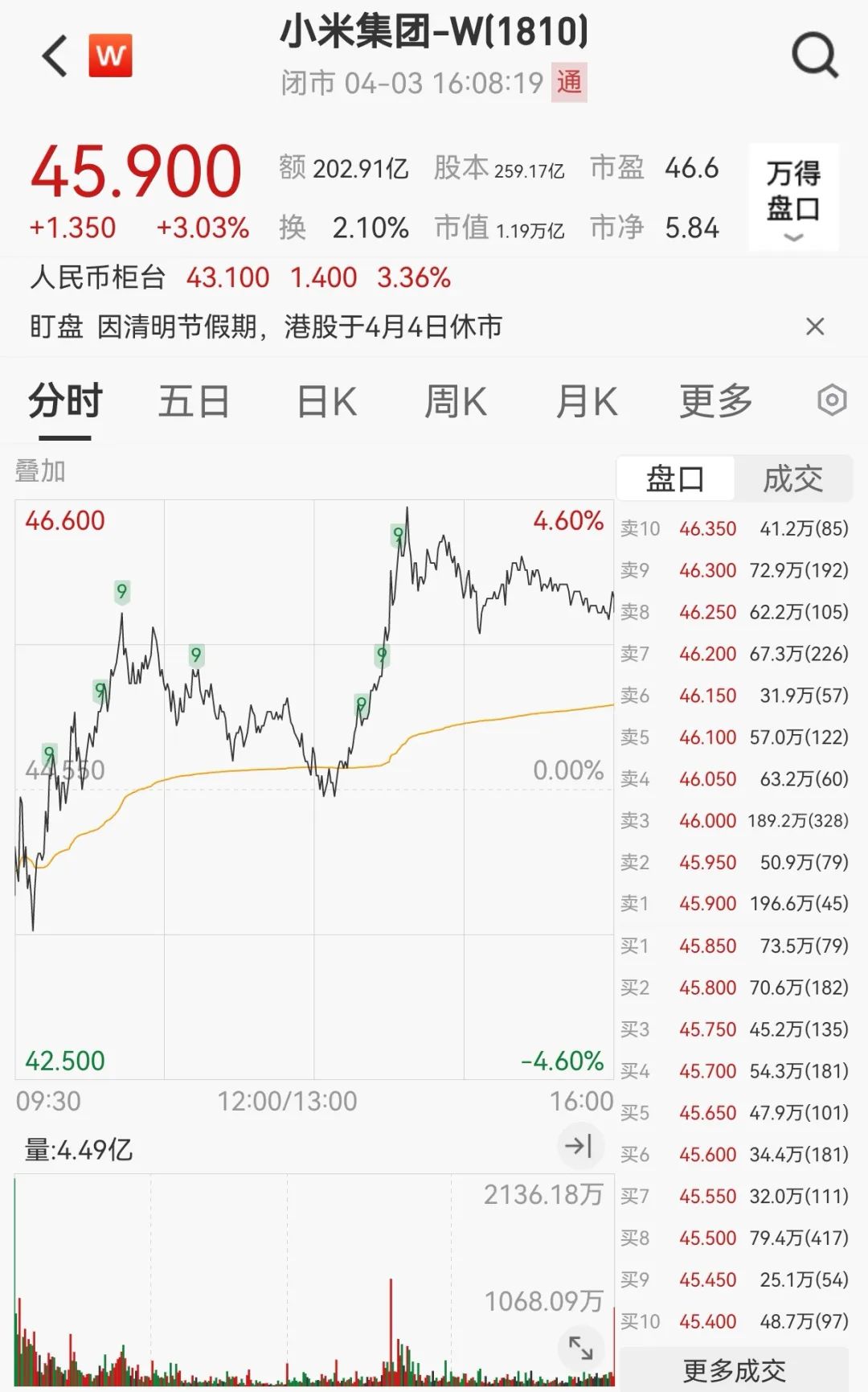 【导读】港股下挫 小米逆市反弹! 中国基金报记者 郭玟君 美国总统特朗普“对等关税”政策落地,远超预期,引发全球金融市场震动,港股同样受到波及。 4月3日,港股三大指数早盘大幅低开,随后震荡上行抹去部分跌幅,午后维持弱势盘整。恒生指数收盘跌1.52%,报22849.81点;恒生科技指数下挫2.09%,报5313.26点;恒生国企指数跌1.31%,报8420.14点。 市场成交额为2894.92亿港元。南向资金越跌越买,净买入额达287.9亿港元,创历史次高。 工业、非必需消费板块跌幅居前,家电股普跌,出口型企业走弱。申洲国际跌14.15%,创科实业跌12.37%,比亚迪电子跌8.73%,领跌蓝筹。 恒生科技指数成份股中,京东集团下挫5.19%,阿里巴巴跌5.00%,腾讯控股跌1.23%。 大消费、公用事业股逆市走强。康师傅控股上涨3.50%,小米集团止跌回升,涨3.03%,领涨蓝筹。 恒生综合行业指数中,恒生工业指数下跌3.77%,恒生非必需性消费行业指数下跌3.21%,恒生原材料业指数下跌2.27%。上涨行业方面,恒生公用事业行业指数上涨0.9%,恒生地产建筑业指数上涨0.42%,恒生必需性消费行业指数上涨0.21%。 Wind香港二级行业指数中,Wind香港家电Ⅱ暴跌6.75%,Wind香港纺织服装Ⅱ下跌3.85%,Wind香港国防军工下跌4.31%。上涨行业方面,Wind香港煤炭Ⅱ上涨0.49%,Wind香港建筑上涨0.54%,Wind香港房地产Ⅱ上涨0.55%。 景顺:美国滞胀的风险提升 短期风险资产将有下行压力 关于美国关税政策,景顺亚太区(日本除外)全球市场策略师赵耀庭发布分析报告表示,这是特朗普政府在全球贸易纷争中发射的第一波炮火,他们以最大限度展开首次行动在情理之中。他说:“我们预计短期内风险资产将出现显著的波动并面临下行压力。” 赵耀庭表示,这些关税对美国消费者和企业造成了巨大负担,他们受到的影响最大。虽然短期内物价会上涨,但随着消费者减少支出以应对关税政策,总需求可能会下降。这无疑增加了美国滞胀的风险,以及这些高关税生效后收益的持续不确定性。 对于短期投资者,赵耀庭表示,采取风险规避策略是明智的。随着投资者寻求避险资产,黄金及其他贵金属、美国国债和其他发达市场政府债券或将表现良好。那些不受公共市场波动影响的另类投资也可能表现不错。亚洲货币可能面临美元走强的阻力,预计亚洲各国央行今年将比美国更早下调政策利率。 对于长线投资者,赵耀庭建议,可通过抛售来增加风险资产敞口,将现金撤离市场,资产配置应保持充分的多样化。 小米集团逆市反弹 3月29日发生一起重大交通事故,引发外界一片哗然。小米集团和雷军站在舆论中心。小米集团股价连跌三天后,于4月3日大幅反弹,全天收于45.90港元,涨幅为3.03%。 事发后,产业链上游企业纷纷和小米汽车撇清关系,四维图新在投资者互动平台表示,公司没有为小米提供智驾方案。公司与小米的其他合作内容涉及保密条款。 继宁德时代表示事故车辆不是他们家的电池之后,比亚迪一位内部人士也表示,他们只提供电芯,电池包是小米自己组装的。 4月3日,惠誉评级机构将小米集团的长期本外币发行人评级为“BBB”,并将展望从“稳定”调整为“正面”。同时确认小米集团全资子公司Xiaomi Best Time International Limited所发行的存续高级无抵押票据的评级为“BBB”。 此前,国信证券发布研报表示,小米集团持续推进高端化和生态协同,看好长期潜力,预计2025年—2027年净利润分别为316亿元、424亿元和608亿元,维持优于大市评级。 编辑:杜妍 校对:乔伊 制作:小茉 审核:木鱼