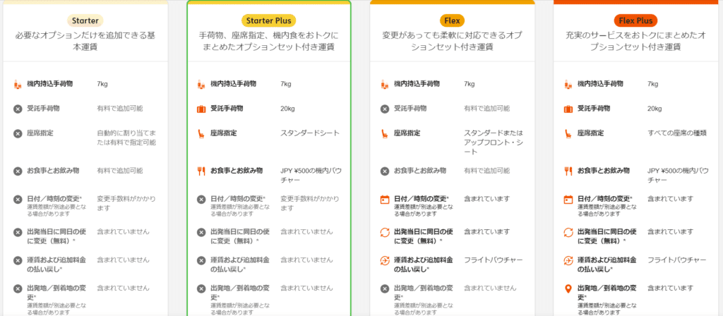 ジェットスターの航空券は公式ホームページから購入可能なのだが、予約する際にいくつか注意しておきたい点がある。 LCCでは、このようにいくつかのプランを選択可能だが、それぞれ細かい違いがある。特に 無料で手荷物を預けることはできるか 無料で払い戻しはできるか 無料で日付や時刻の変更はできるか には気を配りたいところ。4つのプランについて簡単に違いを解説すると、値段やサービスは以下のような順になる。 Starter(低)<<<Starter Plus<Flex<Flex Plus(高) 4つのプランの詳しい違いは以下の通り。 メリット:とにかく安い。JALやANAと比べて3分の1から4分の1程度の運賃が設定されていることもある。さらに座席の指定が可能で、JALのマイルも貯まる。 デメリット:安さの反面、サービスは最低限。無料で手荷物を預けられなかったり、払い戻しができなかったり、日付や時刻の変更ができなかったり... メリット:座席を指定でき、無料で手荷物を預けられる。軽食や飲み物も無料で頼める。 デメリット:Starterに比べると+3000円前後(路線や日付による)。無料で払い戻しができなかったり、日付や時刻の変更ができなかったりする。 メリット:日付や時刻の変更や、払い戻しが無料になる。 デメリット:手荷物を預けられない。値段もそれなりで、Starter Plusと比べると値段は数百円程度高い(路線や日付による)。 メリット:フルサービス。サービス自体はJALやANAとあまり変わらなくなる。 デメリット:値段が高い。Starterに比べると+4000円前後(路線や日付による)。
