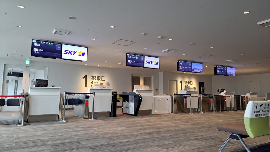 福岡空港の搭乗口は1番だった。端にあるのでかなり歩く必要がある。 ジェットスターなどのLCCでは、搭乗口やカウンターが遠い場合がよくある。座席やサービス以外でもJALやANAとの差が感じられる。