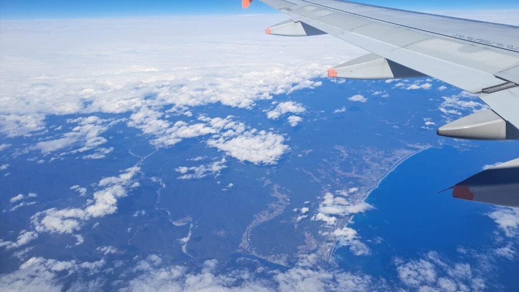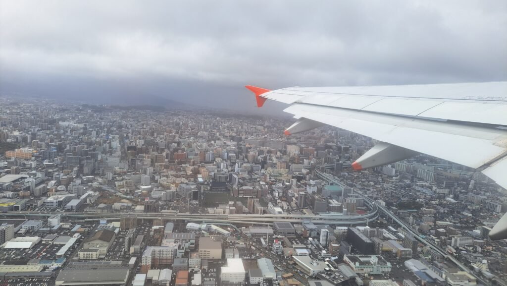 福岡空港を離陸した直後の写真。市街地の近くに空港があるので、福岡の街並みがはっきりと見える。