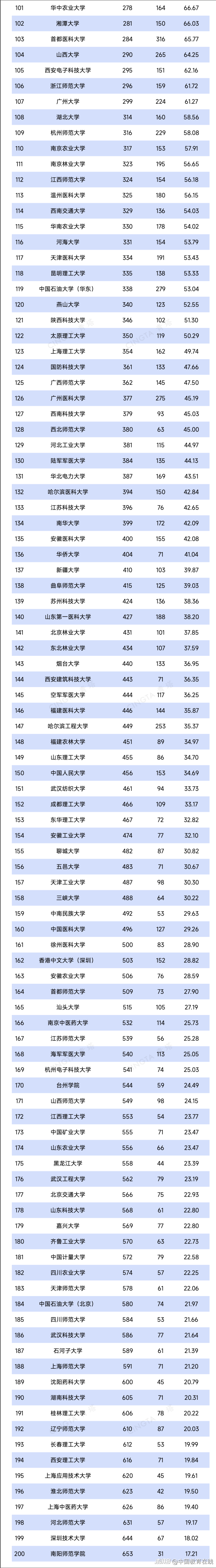 据统计,中国内地高校前10名分别是浙江大学、中国科学技术大学、北京大学、中国科学院大学、清华大学、上海交通大学、南京大学、复旦大学、中山大学和四川大学。浙江大学荣登中国高校榜首。 以上10所高校加上山东大学、吉林大学、武汉大学、华中科技大学、苏州大学、南开大学、南方科技大学、厦门大学、西安交通大学、中南大学、同济大学、天津大学、华南理工大学、湖南大学、哈尔滨工业大学、郑州大学,共计26校进入全球高校排名前50。 非“双一流”高校中,深圳大学、西湖大学进入全球前100,扬州大学、南京工业大学、青岛大学、青岛科技大学、江苏大学、广东工业大学、南方医科大学、浙江工业大学、河南师范大学这9所高校同样表现优异,位居全球高校前200。 最新自然指数排名中国内地高校Top200名单如下: