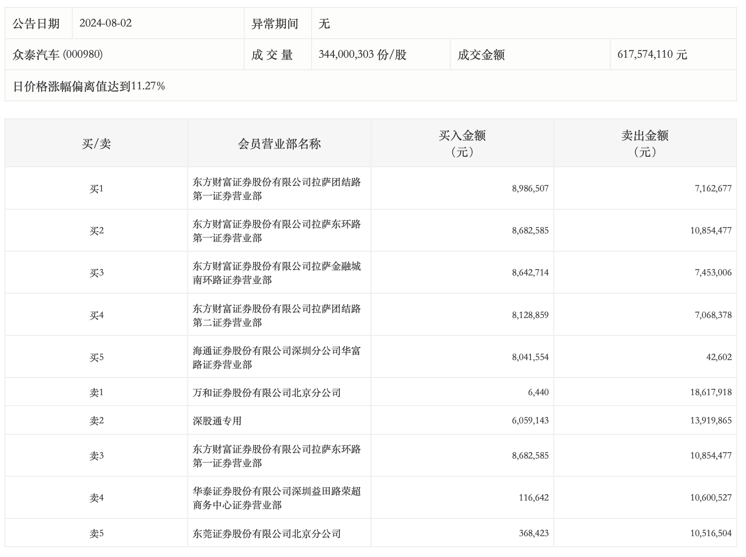8月2日,众泰汽车今日涨停,龙虎榜数据显示,上榜营业部席位全天成交1.35亿元,占当日总成交金额比例为21.9%。其中,买入金额为4903.29万元,卖出金额为8623.6万元,合计净卖出3720.31万元。 具体来看,知名游资现身龙虎榜,著名刺客(东莞证券股份有限公司北京分公司)净卖出1014.81万元。此外,东方财富证券拉萨团结路第一证券营业部、东方财富证券拉萨东环路第一证券营业部分别买入898.65万元、868.26万元;万和证券北京分公司、深股通专用分别卖出1861.79万元、1391.99万元。