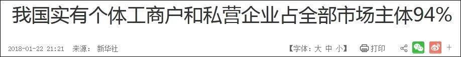 新华社2018年1月报道中,则写着“我国实有个体工商户和私营企业,占全部市场主体94%”。