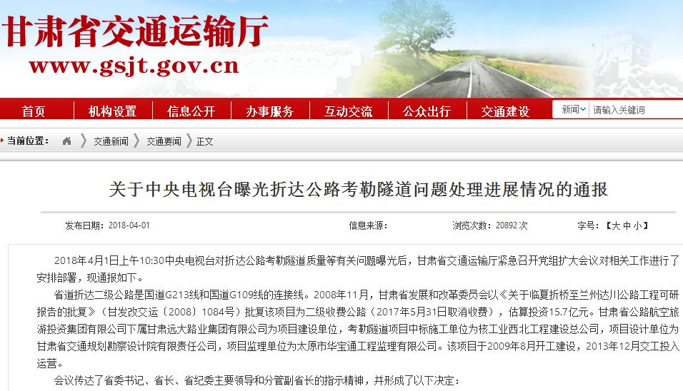 4月1日,央视曝光了甘肃折达公路考勒隧道质量问题。在记者调查过程中,还遭遇多个层级多名官员的各种推诿扯皮和衙门作风。 报道称,折达公路经过甘肃省临夏回族自治州的国家级贫困县东乡县,总投资将近16亿元。 然而,这条扶贫公路却被举报“工程质量差”,特别是其中的“考勒隧道”,原设计中“双层钢筋”,施工后变成了“单层钢筋”,存在严重安全隐患。 据央视报道,考勒隧道内,路基的裂缝随处可见,有的地方的裂缝近一厘米,有的裂缝横跨整个隧道,隧道的墙面随处可见各种裂纹,墙面上修修补补,有水泥和涂料覆盖裂缝的痕迹。 在相关部门接到调查组加固整修的要求后,其措施只是刷涂料,并未封路维修。 记者对有关部门提出问题时,遭遇了多个单位工作人员的各种推诿扯皮。 4月3日的《人民日报》对此发表评论:“去年甘肃因为祁连山生态环境问题被党中央国务院通报,就是因为当时的少数领导干部说一套做一套。祁连山生态保护问题,先后有100多名党政干部被处理,其问责人数之多、力度之大,前所未有。教训言犹在耳,考勒隧道整改却依然阳奉阴违,充分说明,官僚主义、形式主义等不正之风积弊甚深、顽固复杂,决不能掉以轻心。” “政事儿”(微信ID:xjbzse)注意到,经央视曝光后,甘肃省委书记林铎、省长唐仁健及时发声,连续召开多个会议,要求严肃问责。 据4月2日的《甘肃新闻》报道,央视曝光节目播出后,林铎对此批示:“这是一起十分典型的不作为不尽责、官僚主义、衙门作风严重的案例,发生在三令五申要求转变作风、不推诿扯皮、正确对待各方监督的现在,必须严肃问责,责成交通厅党组立即安排查验现场,全面整改路隧问题,向省委省政府作出深刻检查,省监委启动问责程序”。 林铎在批示中,还提到对央视报道的反馈:“省政府正式函复央视,表明我省态度,诚恳接受监督”。 当日上午,甘肃省长唐仁健主持召开了十三届省政府第4次常务会议,安排部署中央电视台反映折达公路考勒隧道安全隐患整改工作。 会议强调,折达公路是“扶贫路”,考勒隧道因“工程质量差”被举报后,整改拖延,问题隧道仍在使用,存在严重安全隐患。在中央及省委、省政府三令五申讲转变作风、不推诿扯皮、正确对待各方监督的情况下,通向贫困县的折达公路不但没有成为群众满意的“暖心”工程,反而成为让群众不满的“寒心”工程,“充分说明我省一些领域一些行业作风顽瘴痼疾十分严重,是一起十分典型的不作为不尽责、官僚主义、衙门作风严重的案例,是坚决不能容忍的”。 会议要求,对折达公路项目全过程进行全面彻查,查明问题、厘清责任,在此基础上对相关责任人依法依规进行处理;“对其中发现的违法违纪或可能存在的腐败问题,按程序移交司法机关处理。” 4月3日上午,林铎又主持召开了甘肃省委常委会,听取省政府党组关于折达公路项目建设基本情况和整改安排的汇报,对折达公路突出问题调查处理和整改工作进行安排部署。 林铎 据《甘肃日报》报道,会议强调,“要充分认识问题的严重性,认真贯彻落实中央领导同志批示指示精神”,坚决扛起全面从严治党主体责任,有力整治政治生态、行政生态等方面的积习积弊,教育督促广大干部把公权力用在正确履职尽责上。 “政事儿”注意到,会议上,甘肃省委对折达公路问题作出定性:折达公路问题性质严重,社会影响恶劣,是一起十分典型的不作为不尽责、官僚主义、衙门作风严重的案例。 会上,甘肃省委用了“震惊和气愤”的表述,评价这一问题:“折达公路2008年开始修建,2013年投入运行,发现质量问题后不认真整改,施工方、业主方、管理方层层不负责任、推诿扯皮,特别是记者采访时,相关部门干部的衙门作风、官僚作派令人震惊和气愤。” 甘肃省委认为,在全国上下深入贯彻落实习近平新时代中国特色社会主义思想、党的十九大和十九届二中、三中全会精神以及全国“两会”精神的背景下,发生折达公路这样严重的问题,反映出我省一些地方、部门和党员干部“四个意识”还不够强,政风、作风方面的顽症痼疾还没有得到彻底根治,以人民为中心的理念还没有真正树立起来,对党和国家事业履职尽责还不到位,必须高度重视、坚决整改。 唐仁健 甘肃省委强调,要尽快组织专家对考勒隧道、折达公路质量进行评估,拿出方案,采取有力措施,全面消除安全隐患和质量问题,同时建立动态通报机制,及时向社会各界通报整改进展,接受新闻媒体和各方面监督。 此次会议也提到了追责工作:要严肃追责问责,责成省政府组成问题调查暨整改工作组,会同省监委进行全面深入调查,既要依法依纪依规严肃处理相关责任人,又要深挖问题根源,发现什么问题就处理什么问题,是谁的责任就追究谁的责任,对工程建设中存在的腐败问题坚决零容忍查处。 甘肃省委要求,要把折达公路问题作为反面案例,作为整治作风顽疾的突破点,推进全面从严治党向纵深发展,加大督查问责力度,健全完善长效机制,层层传导压力,集中整治不作为乱作为、推诿扯皮、敷衍塞责、欺上瞒下、弄虚作假等作风问题,严肃处理一批形式主义、官僚主义、衙门作风严重的反面典型。 “政事儿”(微信ID:xjbzse)注意到,交通部也在问题曝光后第一时间有所反应。交通运输部派出了专项督导组,赴甘肃省对报道反映的工程质量和工作作风问题